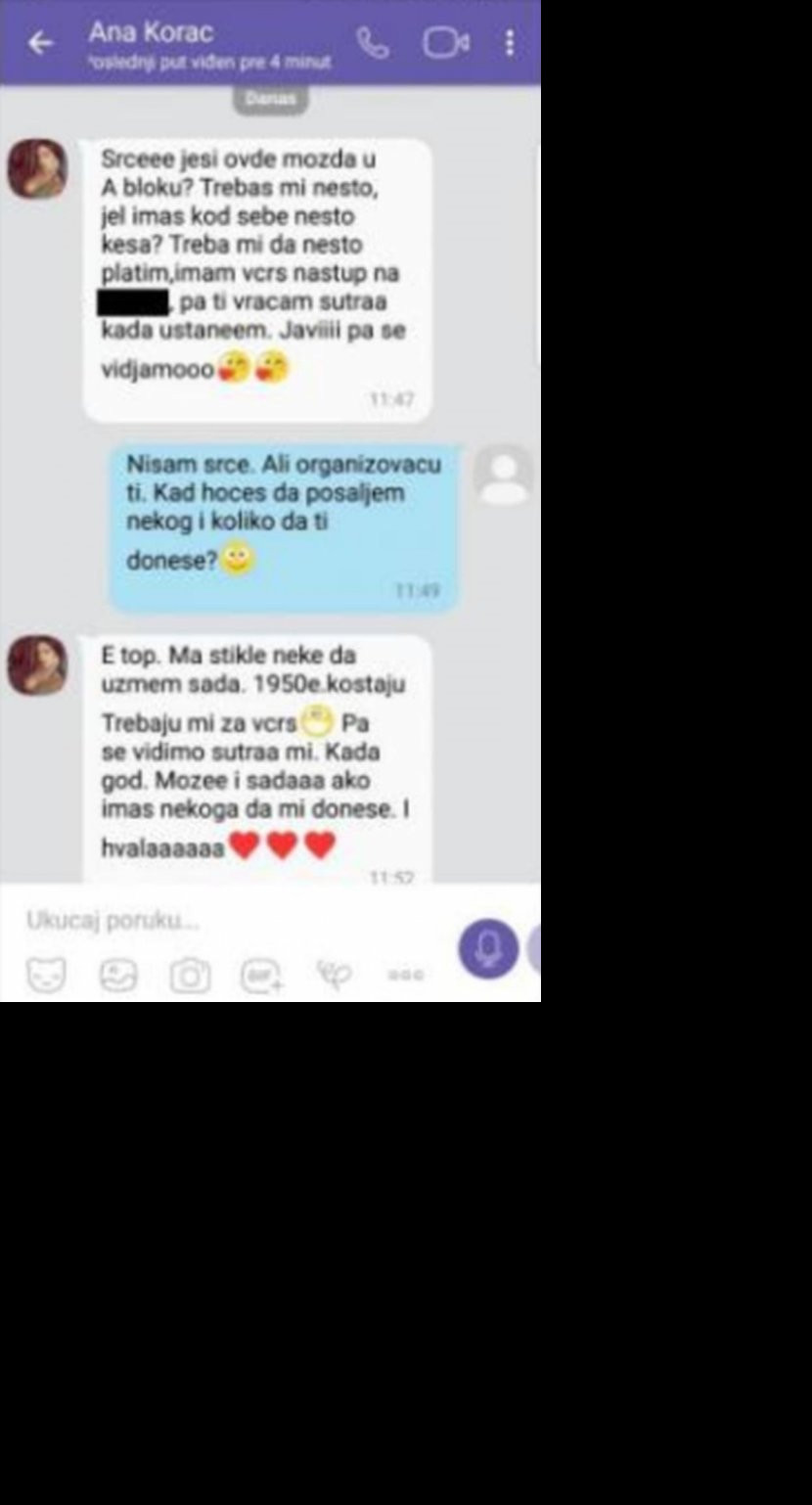 - Srce, jesi ovde možda u A bloku? Trebaš mi nešto, je li imaš kod sebe nešto keša? Treba mi da nešto platim, imam večeras nastup, pa ti vraćam sutra kad ustanem. Javi, pa se viđamo - poručila mu je Ana.