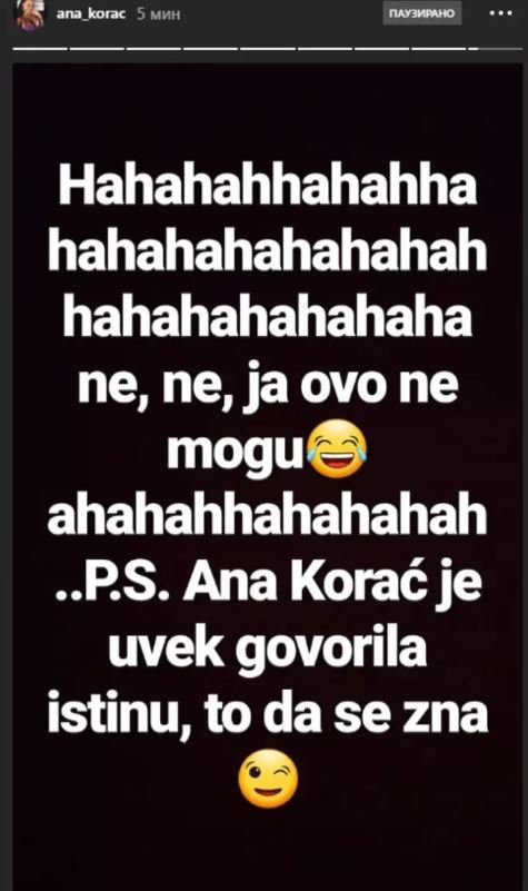 Ne, ne, ja ovo ne mogu! P.S Ana Korać je uvek govorila istinu, to da se zna - napisala je Ana na svom Insta storiju.
