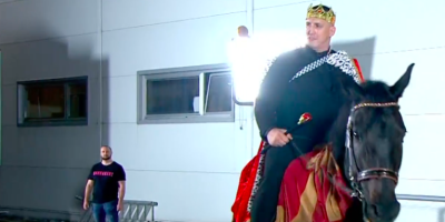On je priredio pravi spektakl i do studija je došao kao pravi srednjovekovni kralj. Na crnom pastuvu, sa krunom na glavi, plaštom skoro do poda, štitom i mačevima, pokušao je da zadivi naciju.