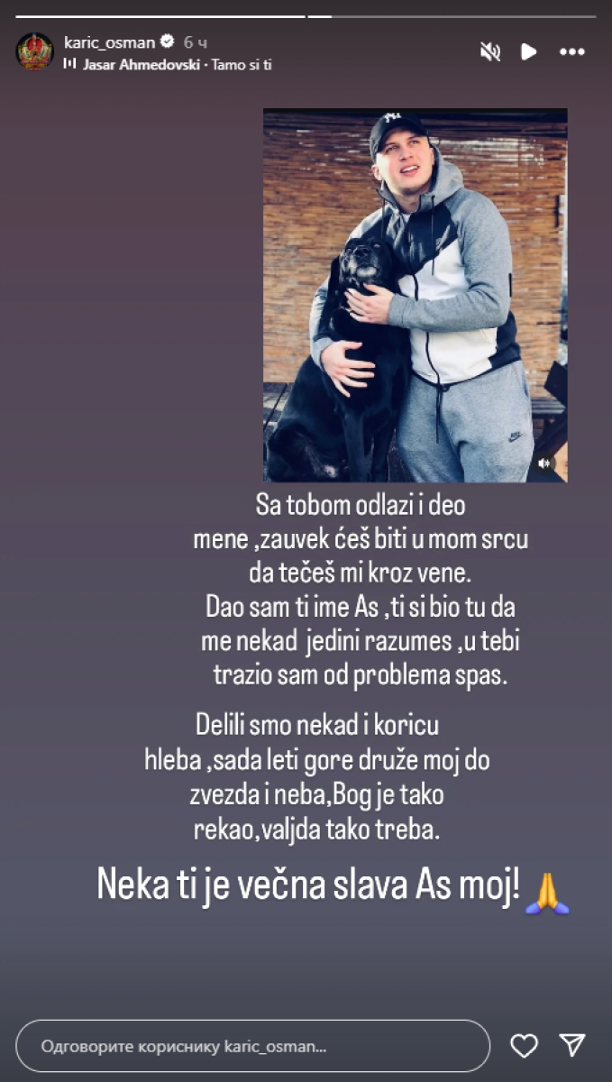 - Sa tobom odlazi i deo mene, zauvek ćeš biti u mom srcu da tečeš kroz vene. Dao sam ti ime As, ti si bio tu da me nekad jedini razumeš, u tebi tražio sam od problema spas. Delili smo nekad i koricu hleba, sada leti druže moj do zvezda i neba. Bog je tako rekao, valjda tako treba. Nek ti je večna slava As moj! - napisao je Karić u objavi.