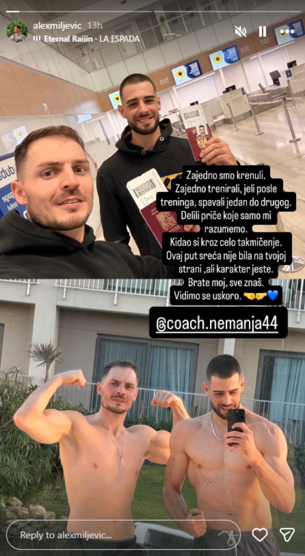 "Zajedno smo krenuli. Zajedno trenirali, jeli posle treninga, spavali jedan do drugog. Delili priče koje samo mi razumemo. Kidao si kroz celo takmičenje. Ovaj put sreća nije bila na tvojoj strani, ali karakter jeste. Brate moj, sve znaš. Vidimo se uskoro", poručio mu je Aleksandar.