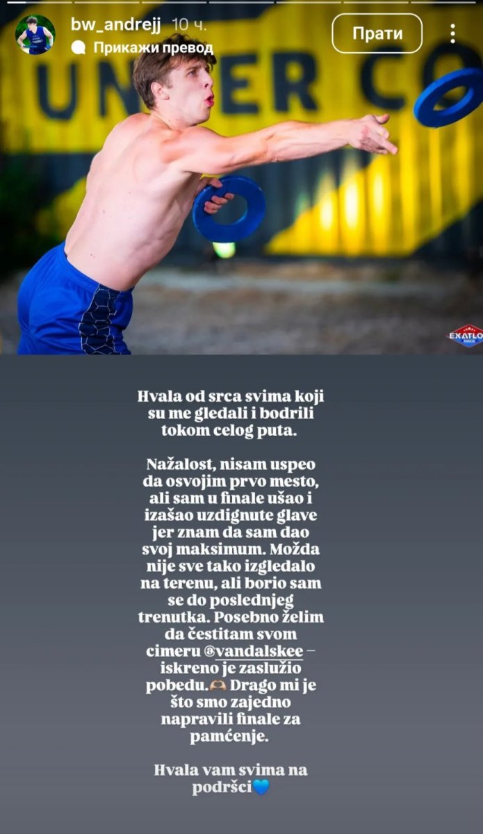 - Hvala od srca svima koji su me gledali i bodrili tokom celog puta. Nažalost, nisam uspeo da osvojim prvo mesto, ali sam u finale ušao i izašao uzdignute glave, jer znam da sam dao svoj maksimum. Možda nije sve tako izgledalo na terenu, ali borio sam se do poslednjeg trenutka - napisao je Andrej i dodao: