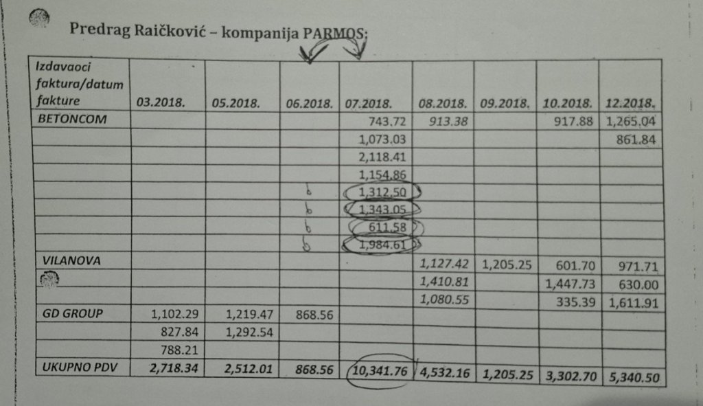 Kada je reč o „Parmosu“, ona navodi da je u obračunu za jul 2018. godine u PDV osnovicu uključeno više faktura iz juna iste godine — konkretno četiri fakture „Betoncom“-a od 01, 04, 10. i 11. juna 2018. godine — iako, kako tvrdi, takav način obračuna nije u skladu sa poreskim periodom.