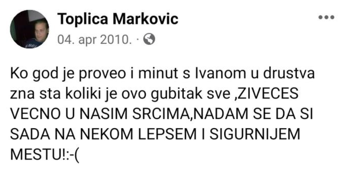 - Ko god je proveo i minut s Ivanom u društvu zna koliki je ovo gubitak. Živećeš večno u našim srcima. Nadam se da si sada na nekom lepšem i sigurnijem mestu - napisao je Marković na dan Uskrsa.