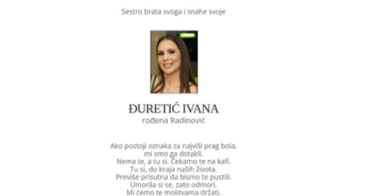 - Ako postoji oznaka za najviši prag bola, mi smo ga dotakli. Nema te, a tu si. Čekamo te na kafi. Tu si, do kraja naših života. Previše prisutna da bismo te pustili. Umorila si se, zato odmori. Mi ćemo te molitvama držati - piše u jednoj od umrlica koje su objavljene na lokalnim portalima.