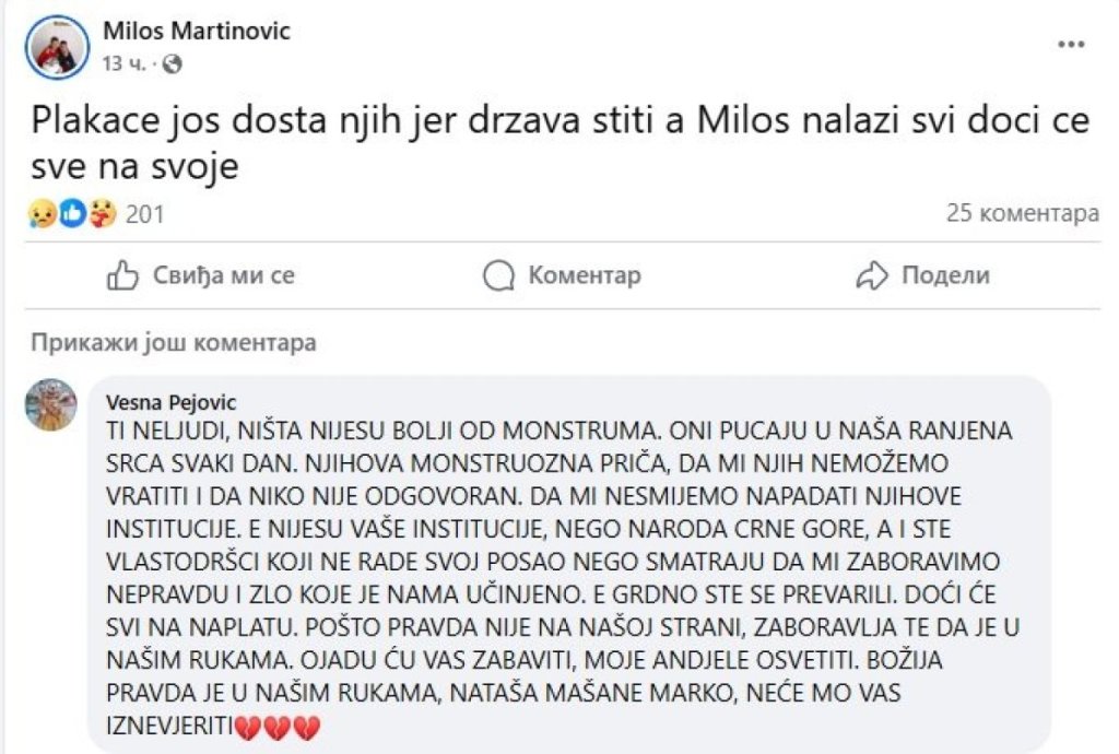 Ispod ovog statusa, koji je lajkovalo 205 njegovih pratilaca, oglasila i i majka ubijene Nataše, Vesna Pejović, koja je poručila da će doći sve na naplatu!
