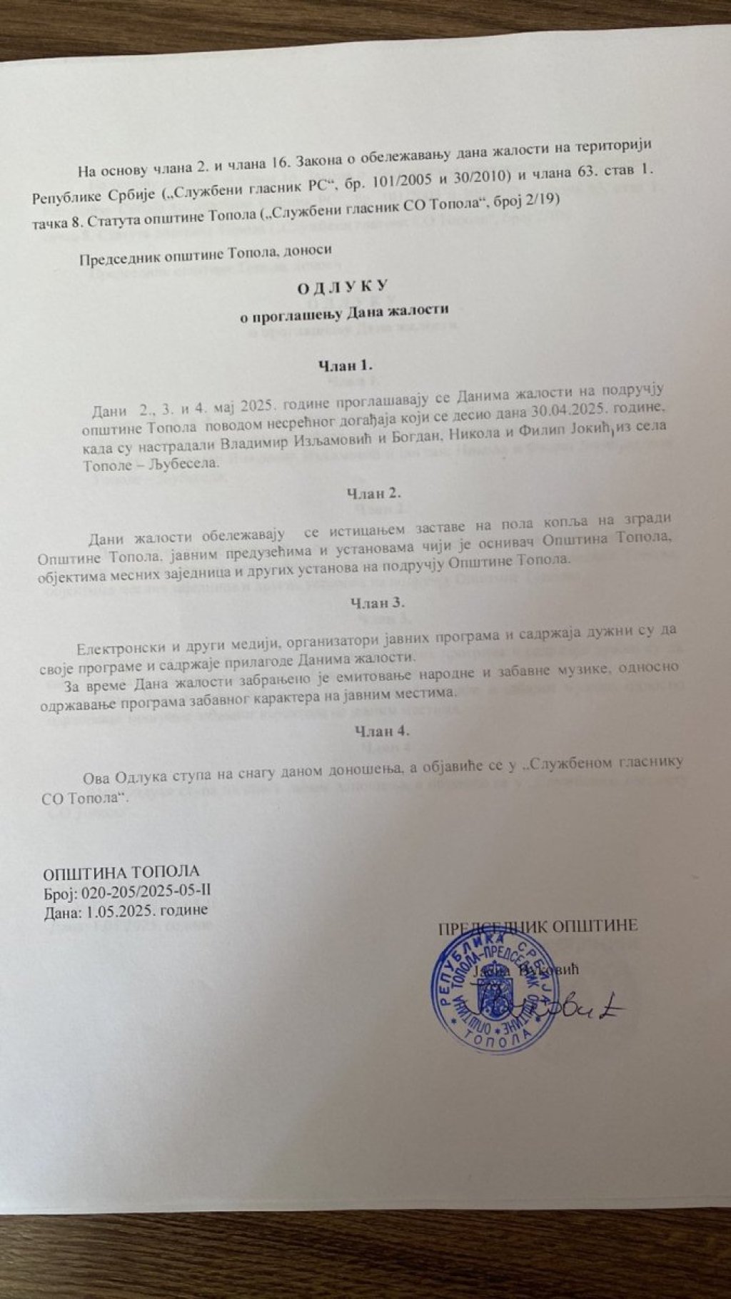 SO Topola proglasila je trodnevnu žalost - 2, 3. i 4. maja.