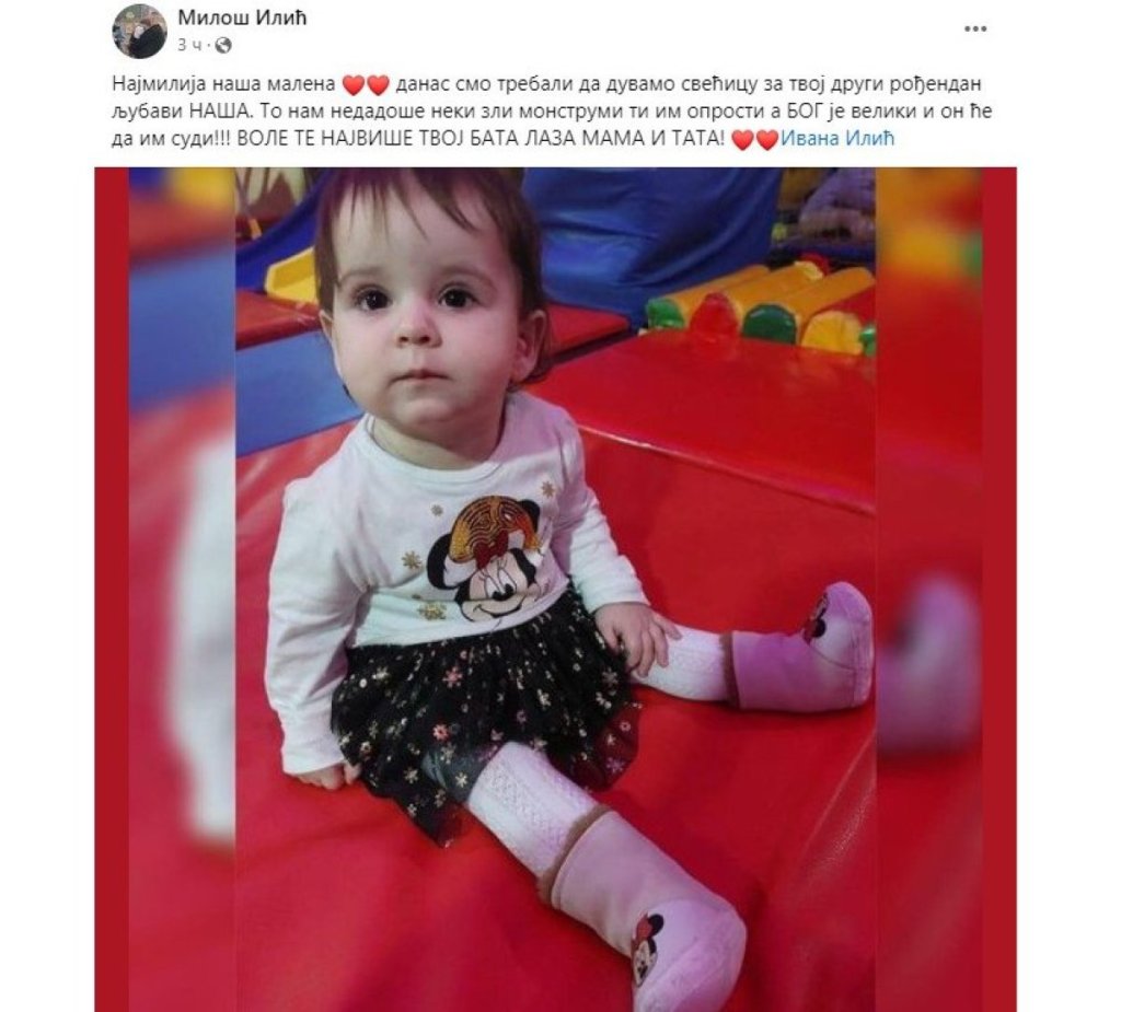 "Najmilija naša malena, danas smo trebali da duvamo svećicu za tvoj drugi rođendan ljubavi naša. To nam ne dadoše neki zli monstrumi ti im oprosti, a Bog je veliki i on će da im sudi! Vole te najviše tvoj bata, mama i tata", napisao je Dankin tata.