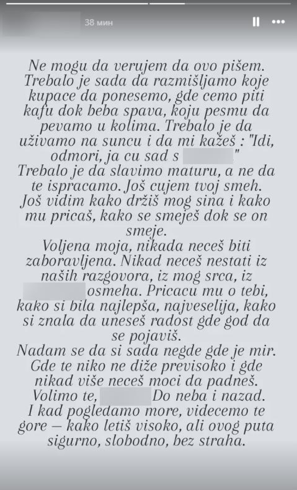 - Ne mogu da verujem da ovo pišem. Trebalo je da sada razmišljamo koje kupaće da ponesemo, gde ćemo piti kafu dok beba spava, koju pesmu da pevamo u kolima. Trebalo je da uživamo u suncu i da mi kažeš: "Idi, odmori, ja ću sad sa bebom". Trebalo je da slavimo maturu, a ne da te ispraćamo. Još čujem tvoj smeh. Još vidim kako držiš mog sina i kako mu pričaš, kako se smeješ dok se on smeje - navela je neutešna žena.