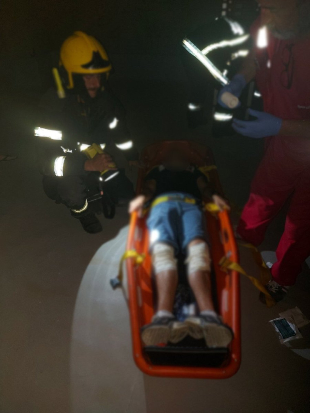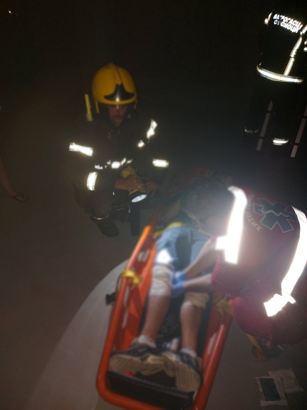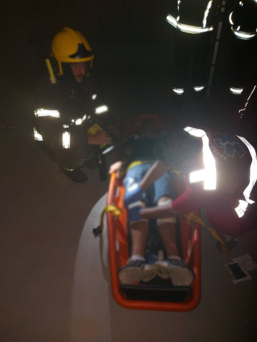 Za samo nekoliko minuta stigli su do dečaka, stavili ga u korito, a zatim užem i lestvama spustili na bezbedno i predali lekarskoj ekipi Hitne pomoći.