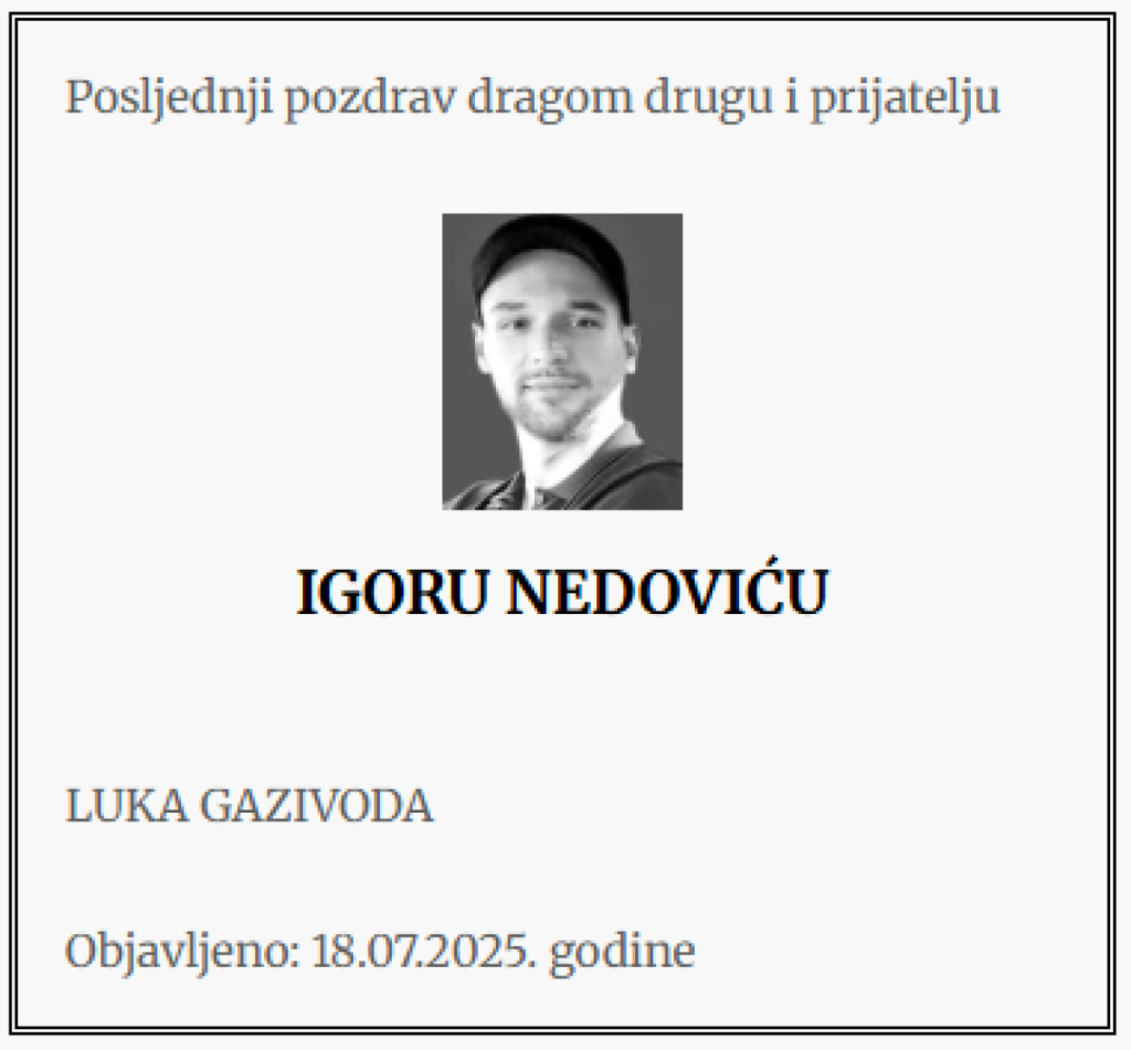 Igor Nedović (29) ubijen je u Podgorici ispred porodične kuće u Staroj varoši, a od njega su se čituljom oprostili njegovi drugovi iz "kavačkog klana".