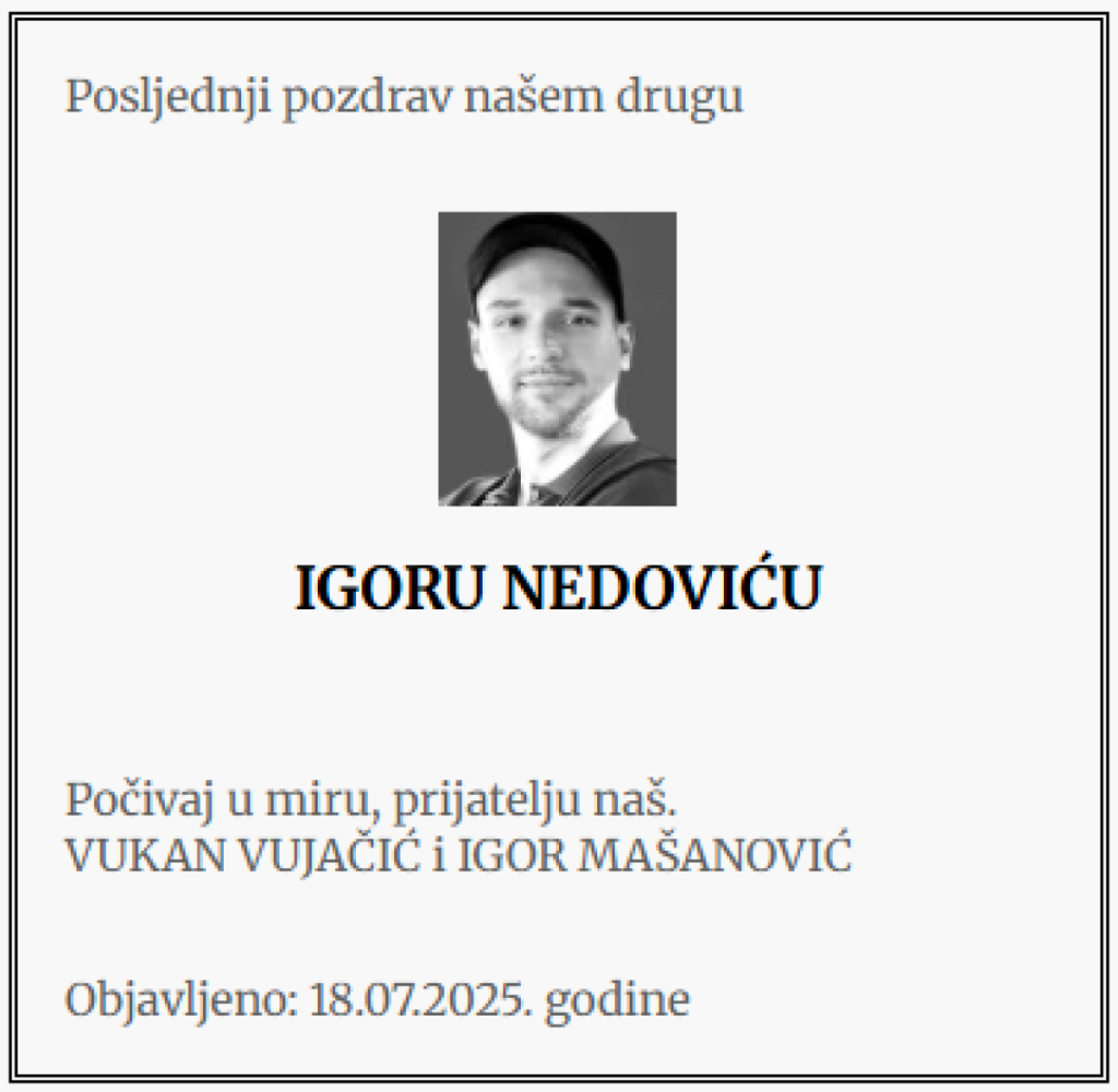 Čitulje za Nedovića dali su Vukan Vujačić, Igor Mašanović i Luka Gazivoda.