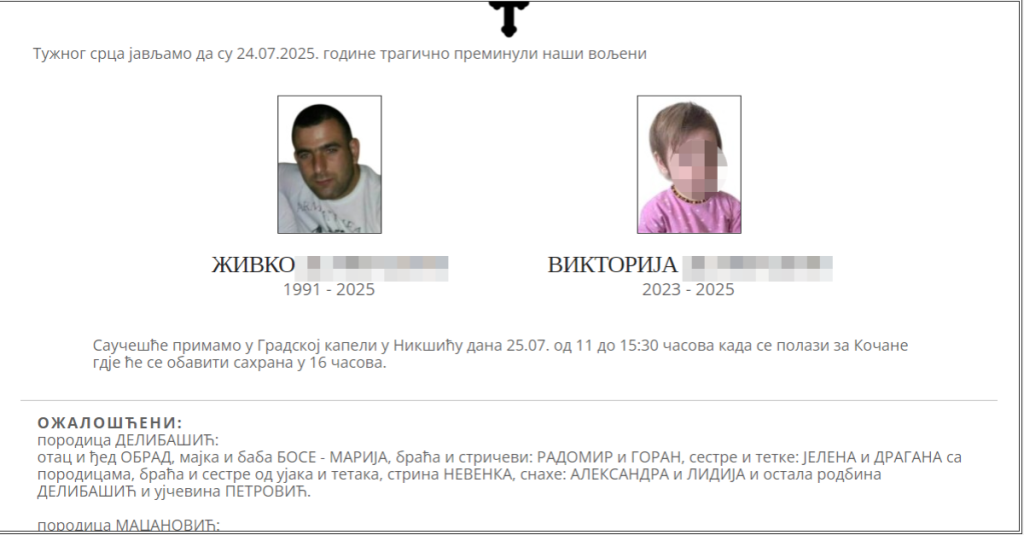 Na sajtu umrli.me, objavljena je čitulja za oca i ćerku, te se u njoj navode ožalošćeni, ali i to da će otac i ćerka biti sahranjeni u isto vreme, na istom groblju, da li u zajedničku grobnicu ostaje da se vidi.