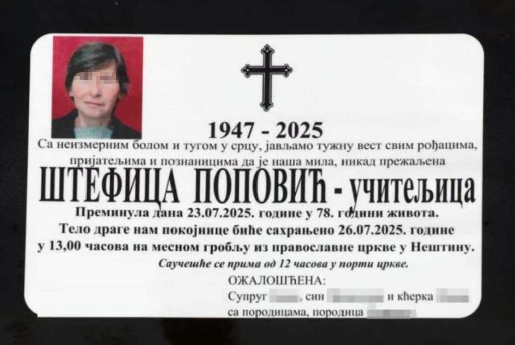 - Sa neizmernim bolom i tugom u srcu javljamo svim rođacima, prijateljima i poznanicima da je naša mila, nikad preželjena Štefica Popović, učiteljica, preminula dana 23. jula u 78. godini života. Telo drage nam pokojnice biće sahranjeno na mesnom groblju u Neštinu - piše u umrlici koja se nalazi na ulazu u porodičnu kuću Popovića.