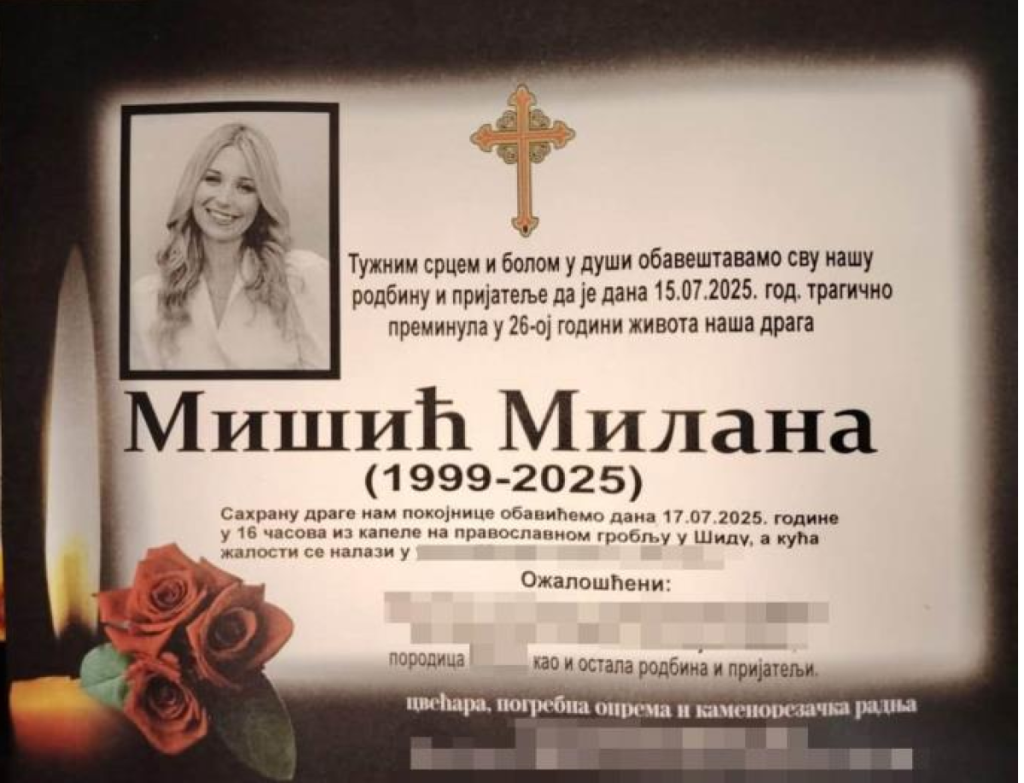 - Tužnim srcem i bolom u duši obaveštavamo svu našu rodbinu i prijatelje da je 15. jula tragično preminula u 26. godini života naša draga Mišić Milana. Sahranu drage nam pokojnice obavićemo dana 17. jula iz kapele na pravoslavnom groblju u Šidu - stoji na umrlici.