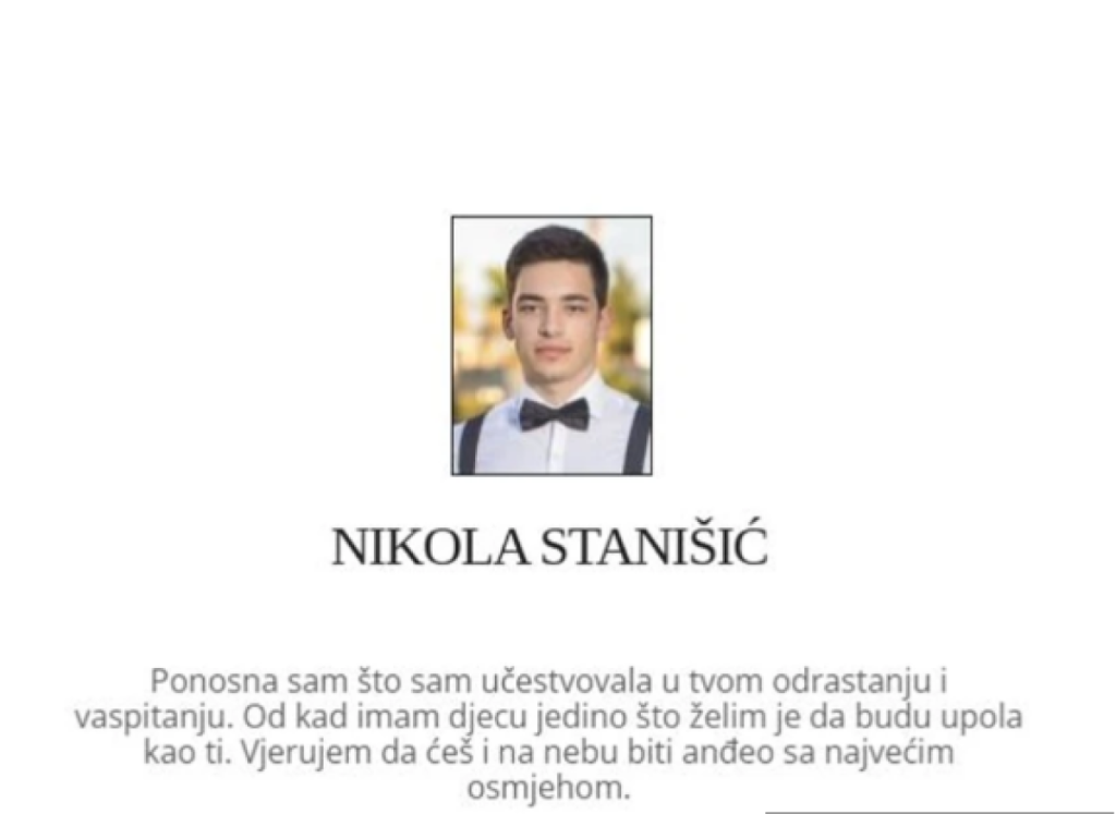 - "Ne postoje reči utehe koje mogu da izraze neizmernu bol i tugu zbog vaših tragično izgubljenih života. Sećanjima na vaše plemenite duše čuvaćemo vas od zaborava. Počivajte u miru", "Nikola, ponosna sam što sam učestvovala u tvom odrastanju i vaspitanju. Od kad imam decu jedino što želim je da budu upola kao ti. Verujem da ćeš i na nebu biti anđeo sa najvećim osmehom" - piše u čituljama.