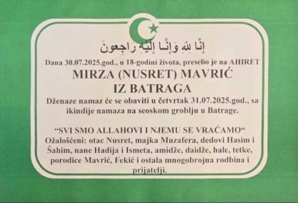 Porodica Mirza Mavrića (17), mladić koji je preminuo noćas zbog povreda zadobijenih ubodima, tokom masovne tuče u Novom Pazaru, objavila je umrlicu, kojom se poslednji put oprostila od svog sina, unuka, sestrića...
