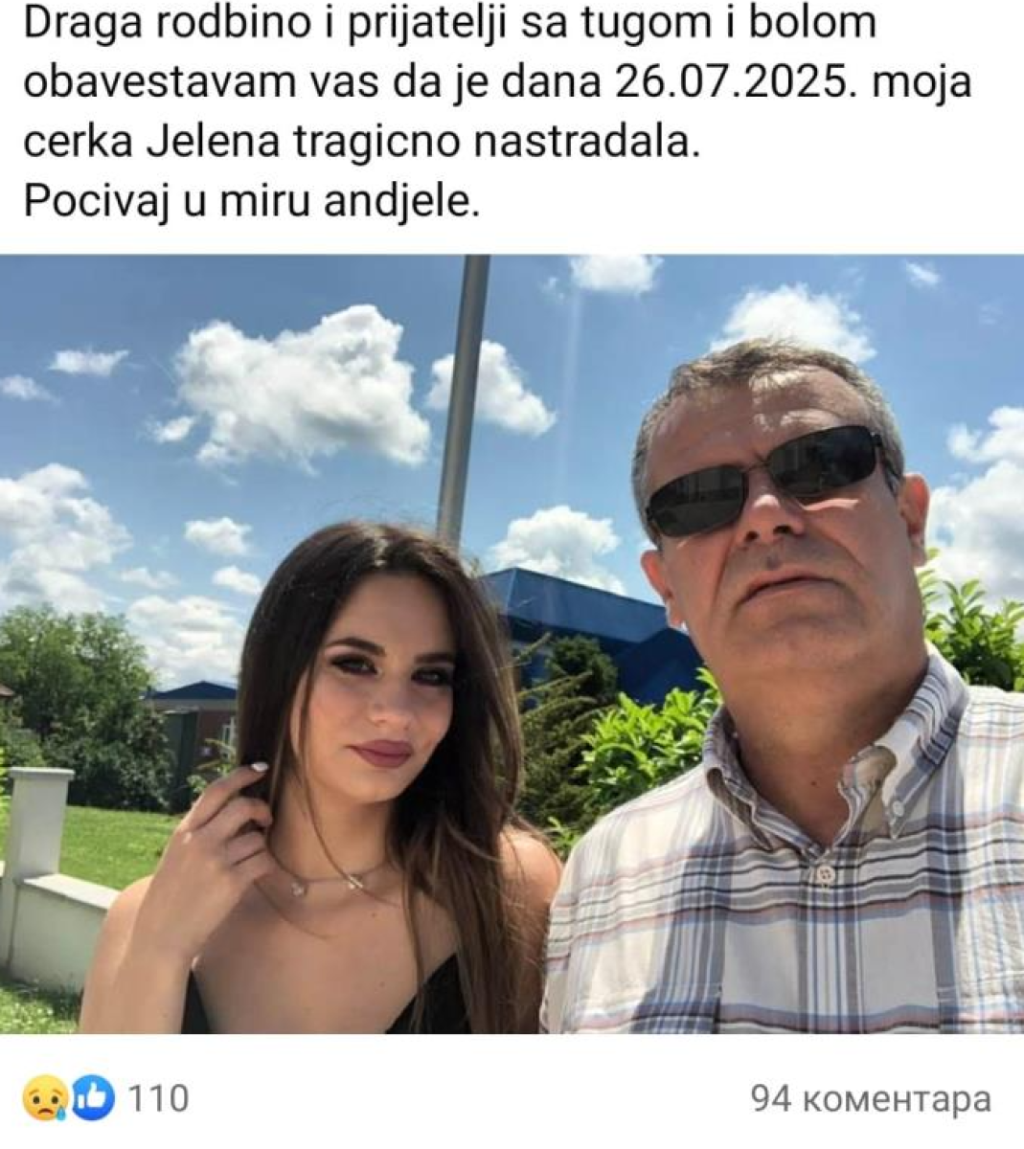 "Draga rodbino i prijatelji sa tugom i bolom obaveštavam vas da je dana 26. jula 2025. godine moja ćerka Jelena tragično nastradala. Počivaj u miru, anđele" - glasio je status na Fejsbuk profilu oca Jelene R. (22) iz Lazarevca, koja je poginula u jezivoj saobraćajnoj nesreći zajedno sa svojom drugaricom Bojanom Ć. (22).