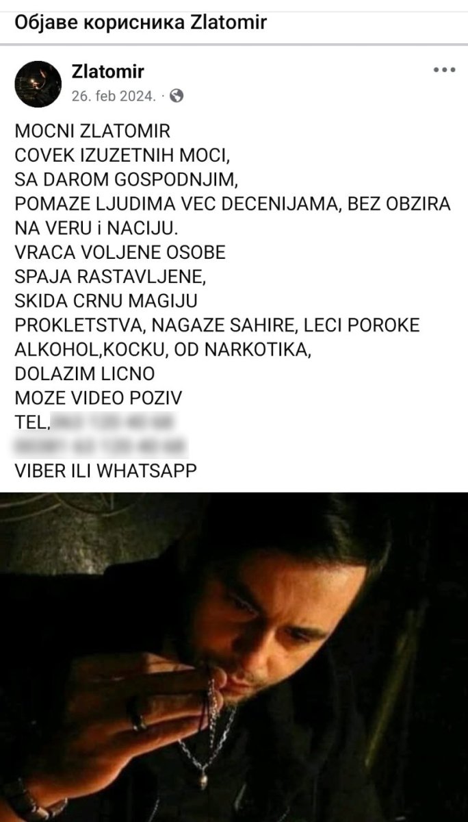 Na Fejsbuk profilu i dalje stoji reklama tzv. proroka u kojoj sebe naziva “čovekom sa izuzetnim moćima sa darom gospodnjim, pomaže ljudima već decenijama bez obzira na veru i naciju, vraća voljene osobe, spaja rastavljene, skida crnu magiju, prokletsstva, nagaze sahire, leči poroke, alkohol, kocku, od narkotika. “Dolazim lično, može video poziv”. Kao što je Smiljana kazala, broj koji je ostavljen, sada je nepostojeći.