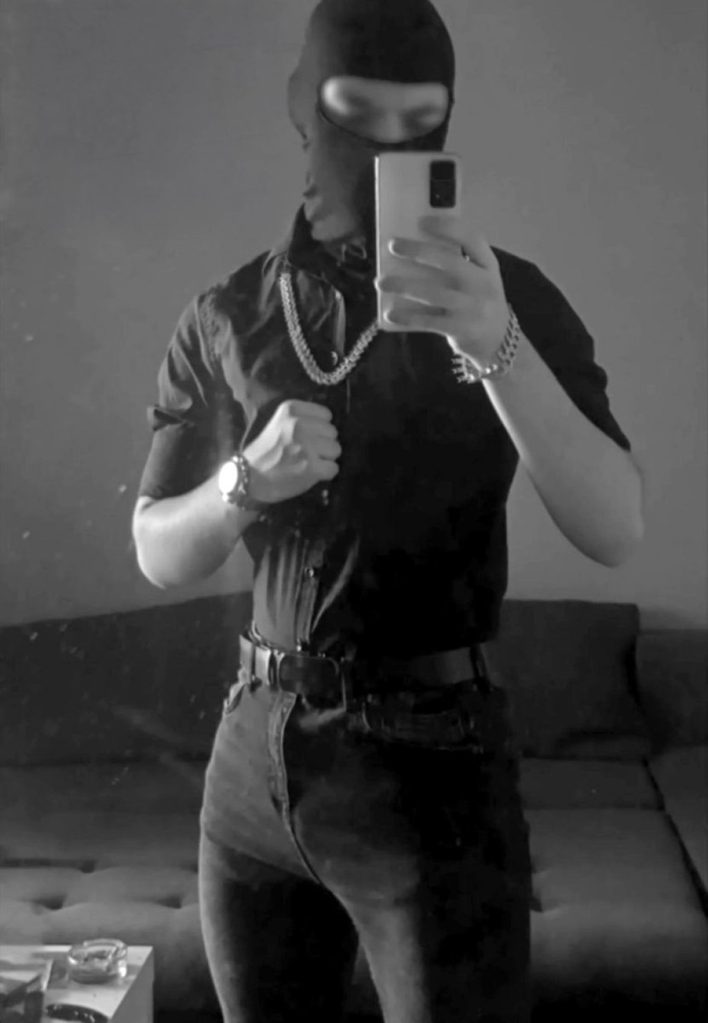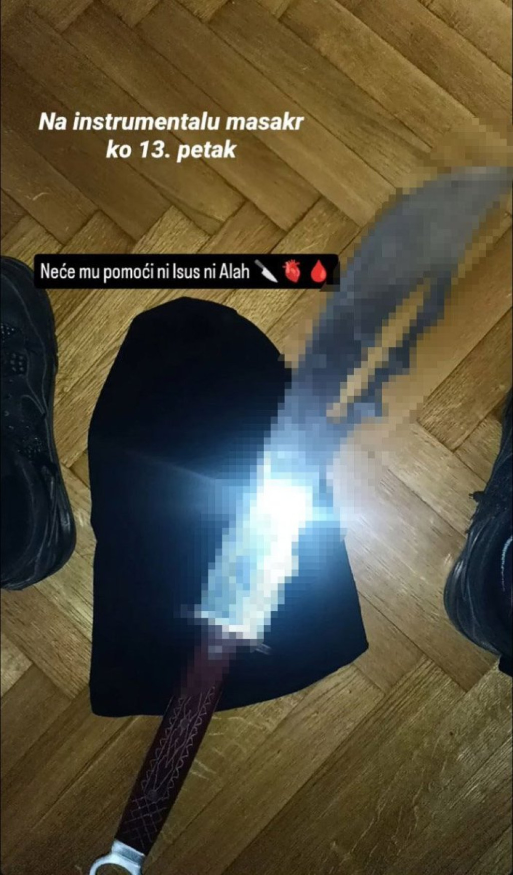 Takođe, u jednoj objavi poziva na nasilje i masovno ubistvo uz fotografiju mačete i reči jedne pesme: ''Na instrumentalu masakr ko 13. petak, neće mu pomoći ni Isus ni Alah''.
