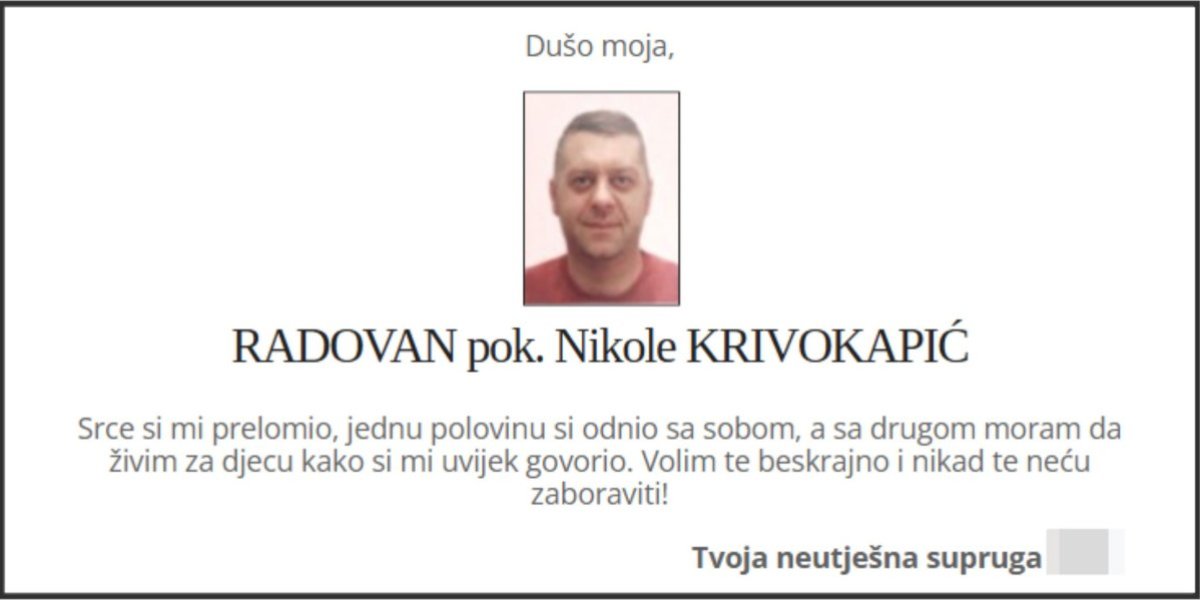 "Srce si mi prelomio, jednu polovinu si odneo sa sobom, a sa drugom moram da živim za decu kako si mi uvek govorio. Volim te beskrajno i nikad te neću zaboraviti", napisala je neutešna supruga u čitulji.