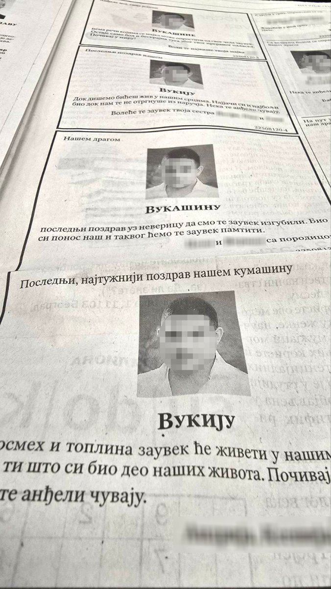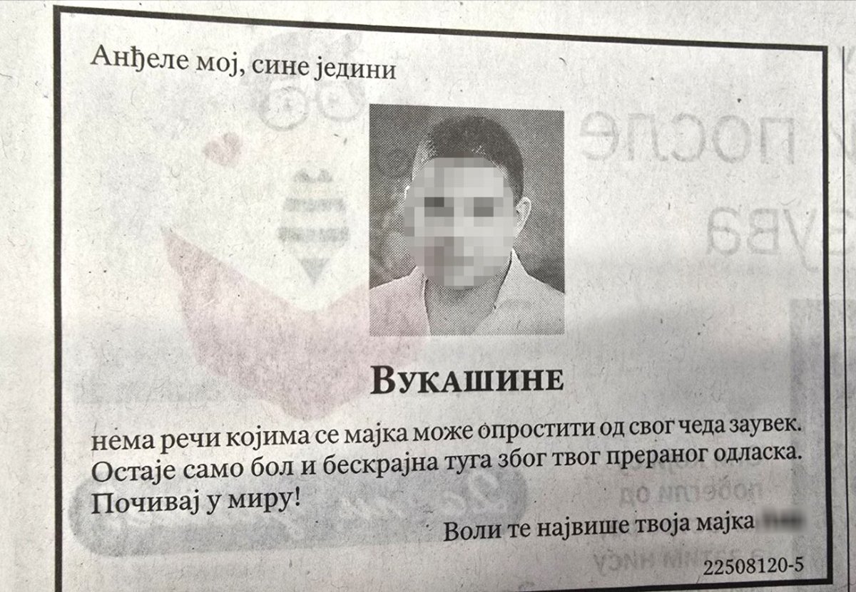 Dana su se u čituljama od Vukašina oprostili rođaci i prijatelji, a među njima i majka ubijenog mladića.