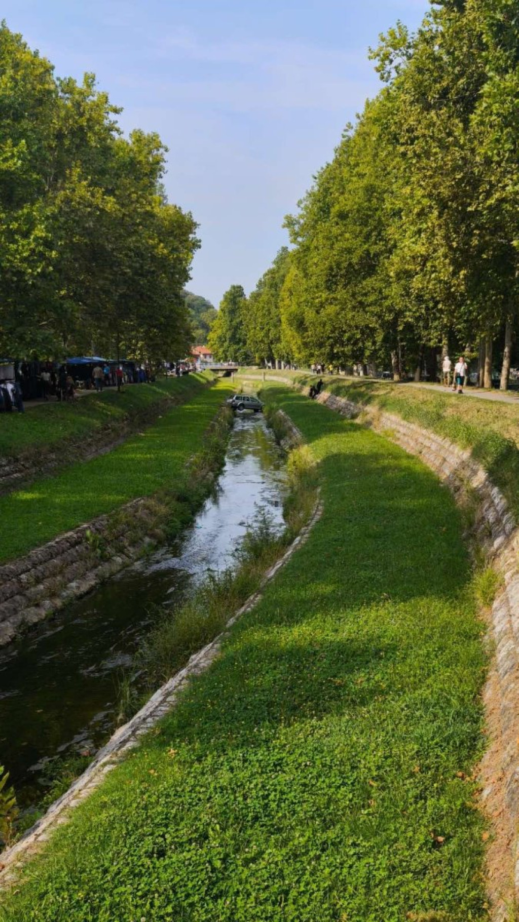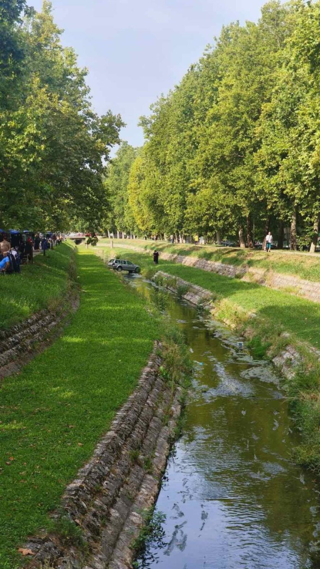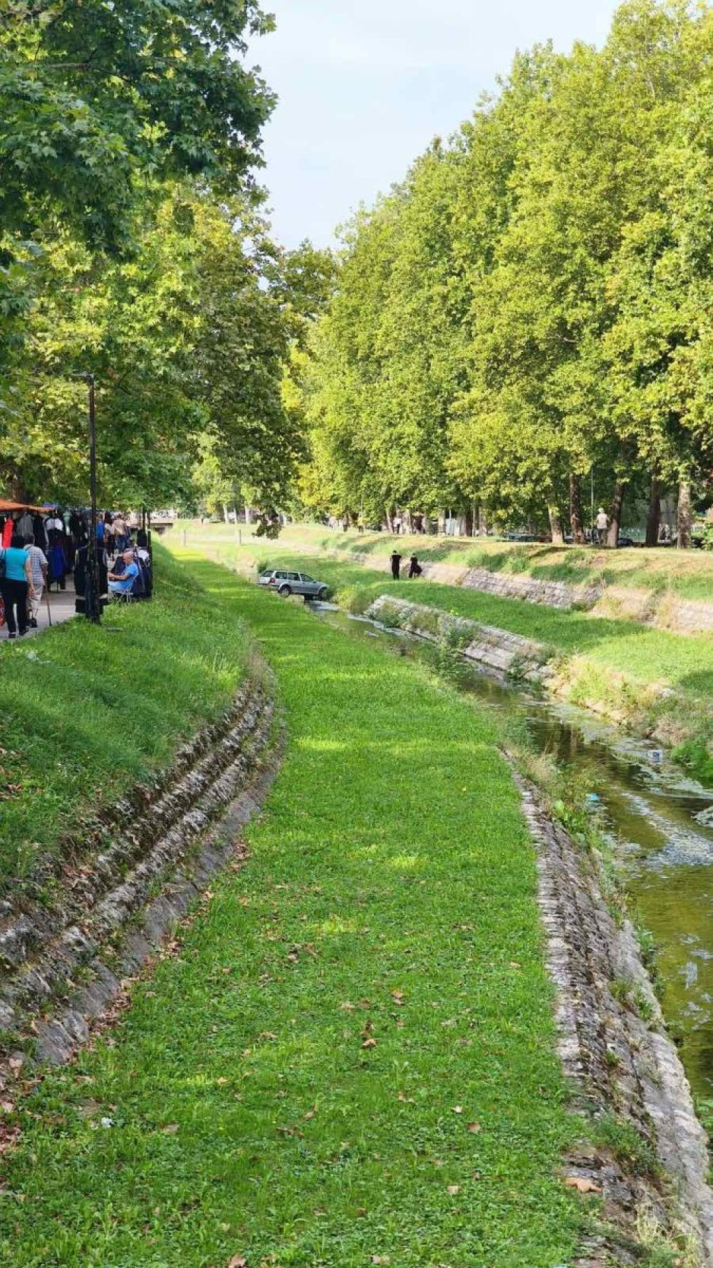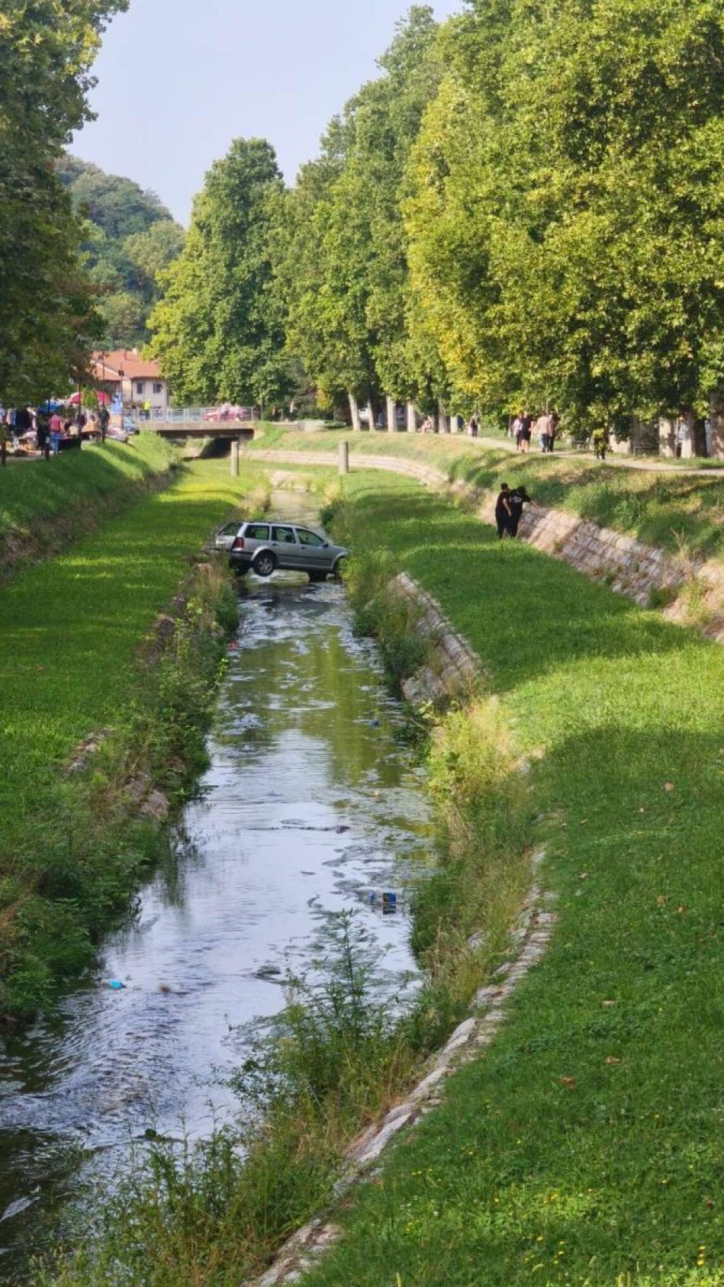 Vozilo se zaustavilo na kosini obale, a prolaznici su se okupili posmatrajući nesvakidašnji prizor.