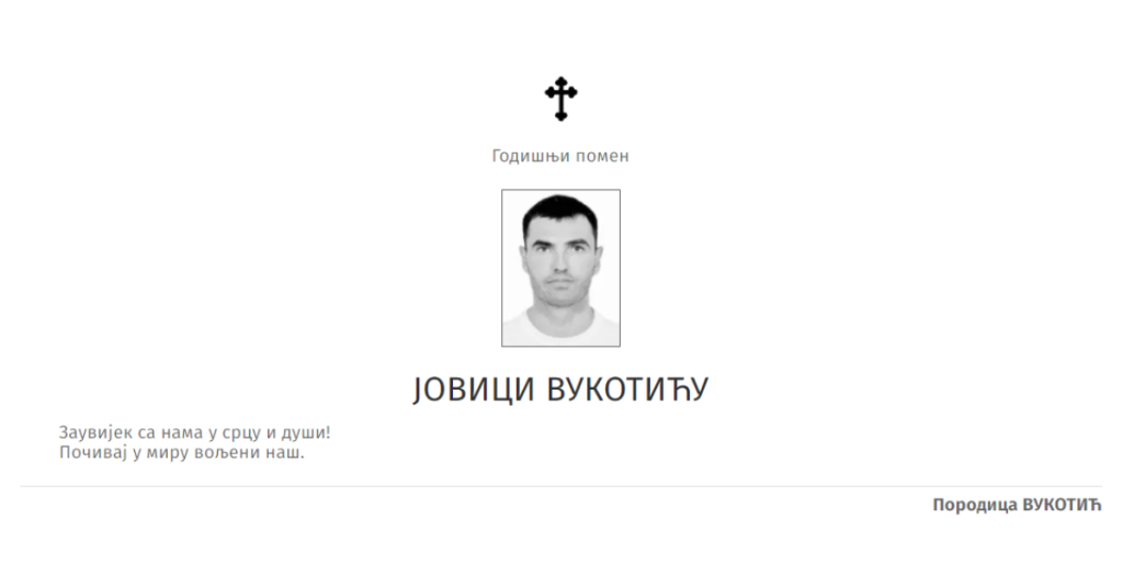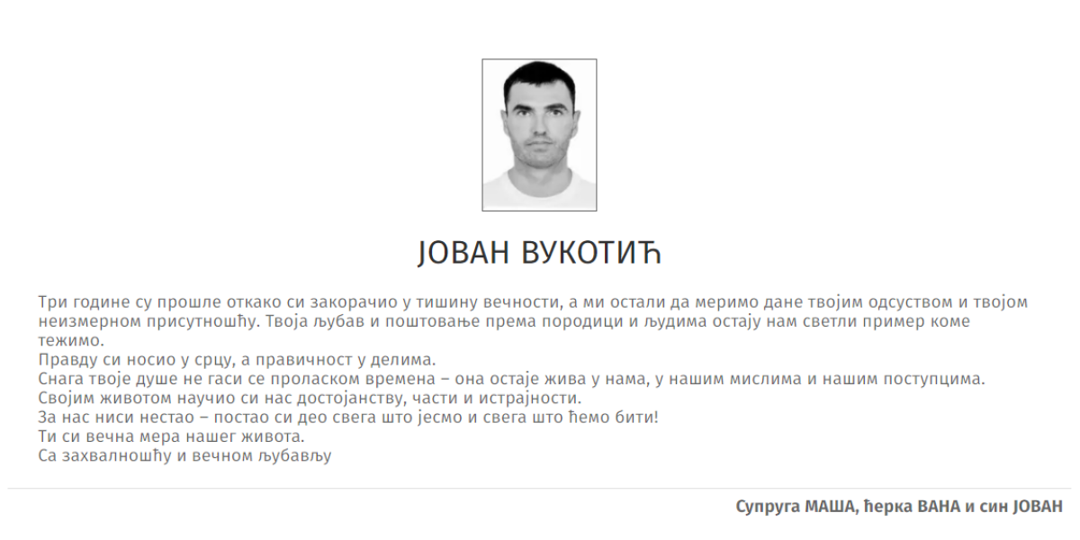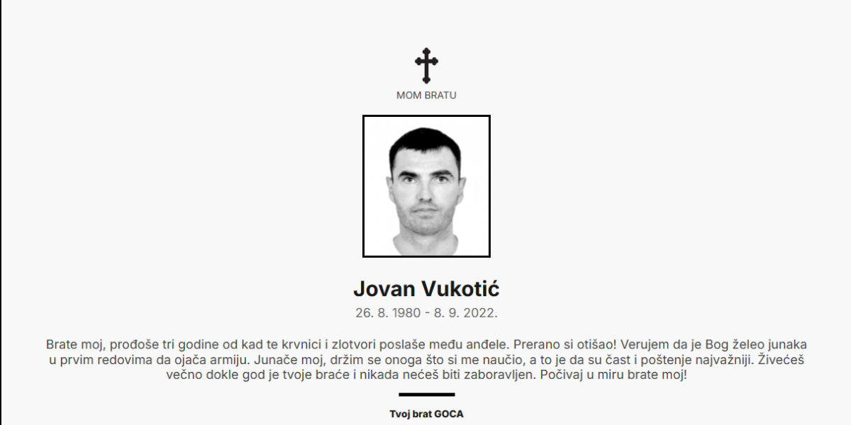 "Brate moj, prođoše tri godine od kad te krvnici i zlotvori poslaše među anđele. Prerano si otišao! Verujem da je Bog želeo junaka u prvim redovima da ojača armiju. Junače moj, držim se onoga što si me naučio, a to je da su čast i poštenje najvažniji. Živećeš večno dokle god je tvoje braće i nećeš biti zaboravljen. Počivaj u miru brate moj!" piše u čitulji koju je za Jovana Vukotića dao njegov brat "Goca".