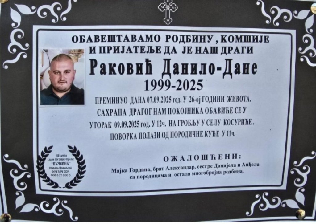 Danilo Dane Raković (26) iz sela Kosuriće kod Novog Pazara preminuo je 7. septembra u Kliničko-bolničkom centru u Kragujevcu od posledica povreda zadobijenih u prevrtanju traktora.