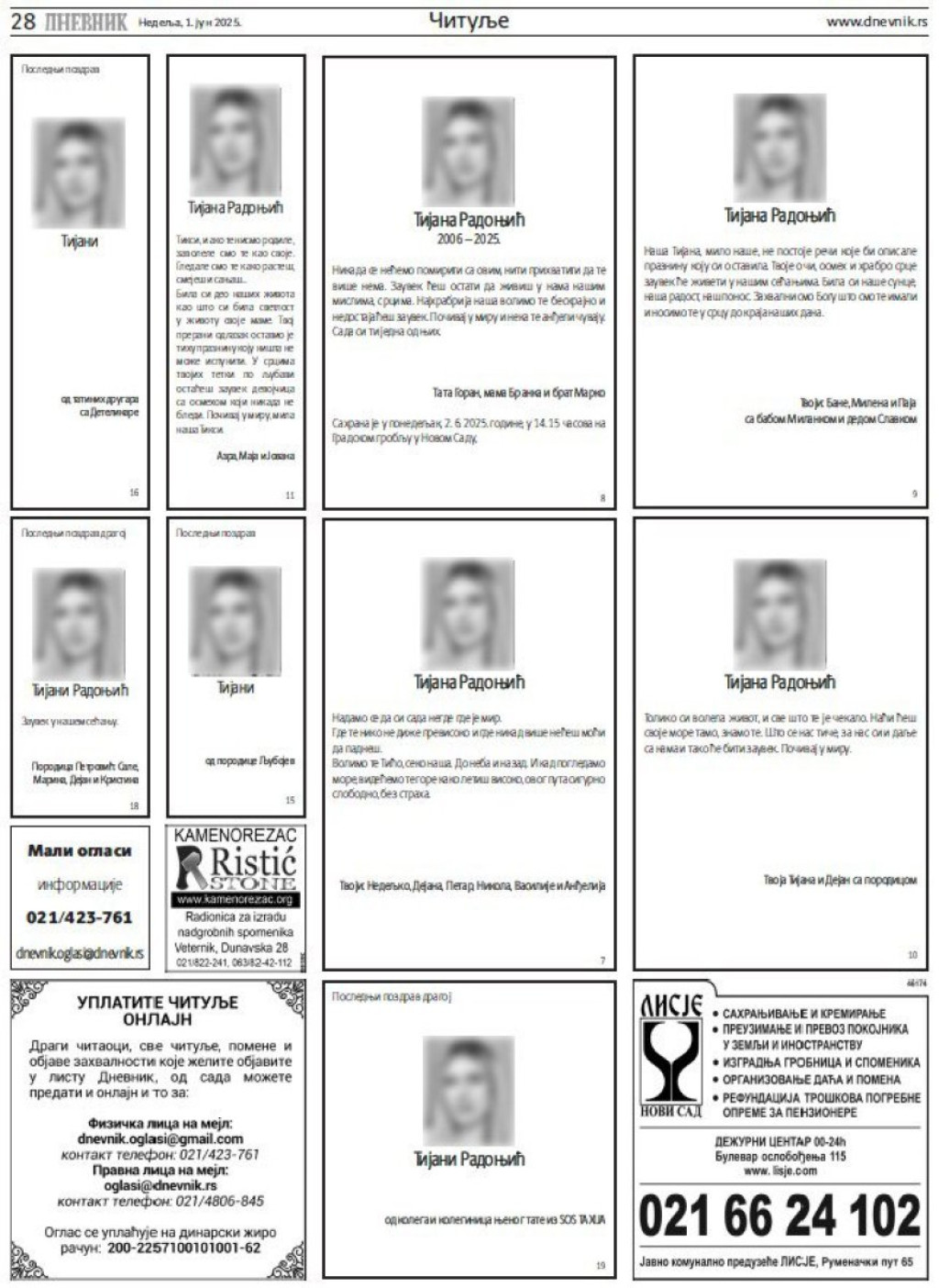 Novosađanka Tijana Radonjić (19) nastradala je 28. maja u Budvi tokom promotivnog parasejlinga, kada je pala u more sa visine od oko 150 metara. Prema obdukcionom nalazu, uzrok smrti je utapanje usled gušenja (asfiksije), praćeno traumom pluća i unutrašnjim krvarenjem izazvanim teškim povredama grudnog koša.
