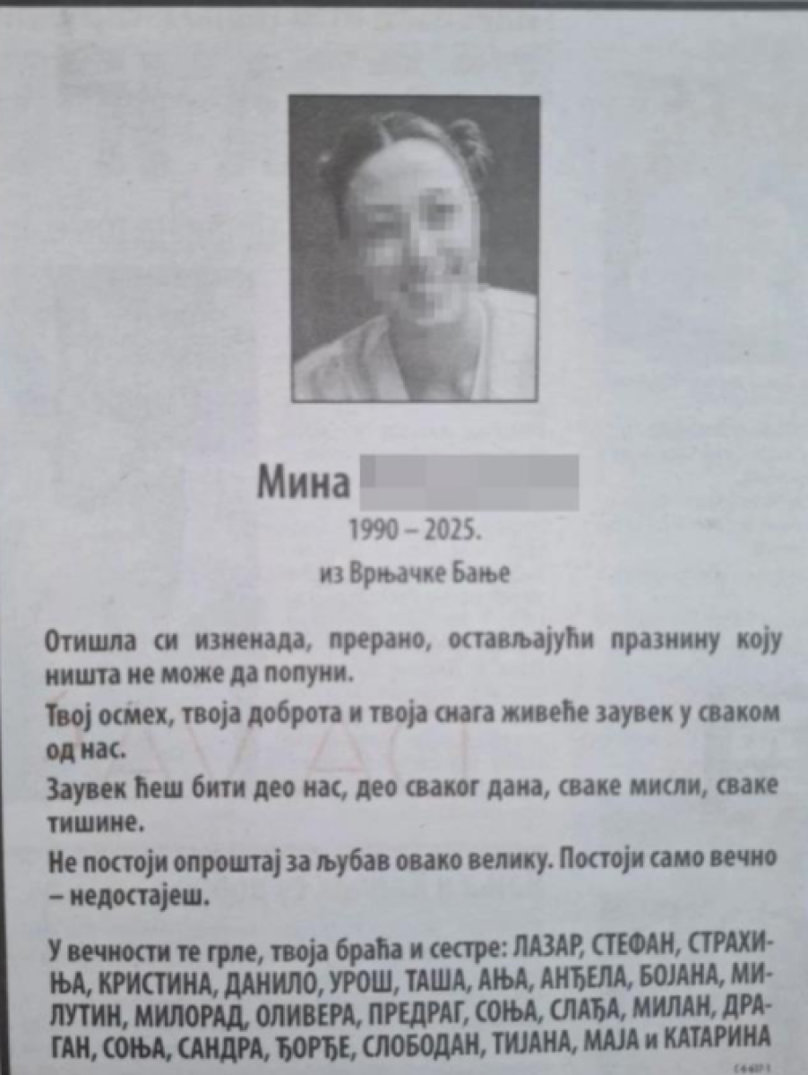 ,,Otišla si iznenada, prerano, ostavljajući prazninu koju ništa ne može da popuni. Tvoj osmeh, tvoja dobrota i tvoja snaga živeće zauvek u svakom od nas. Zauvek ćeš biti deo nas, deo svakog dana, svake misli, svake tišine. Ne postoji oproštaj za ljubav ovako veliku. Postoji samo večno - nedostaješ. U večnosti te grle, tvoja braća i sestre,'' navodi se u jednoj od čitulja.