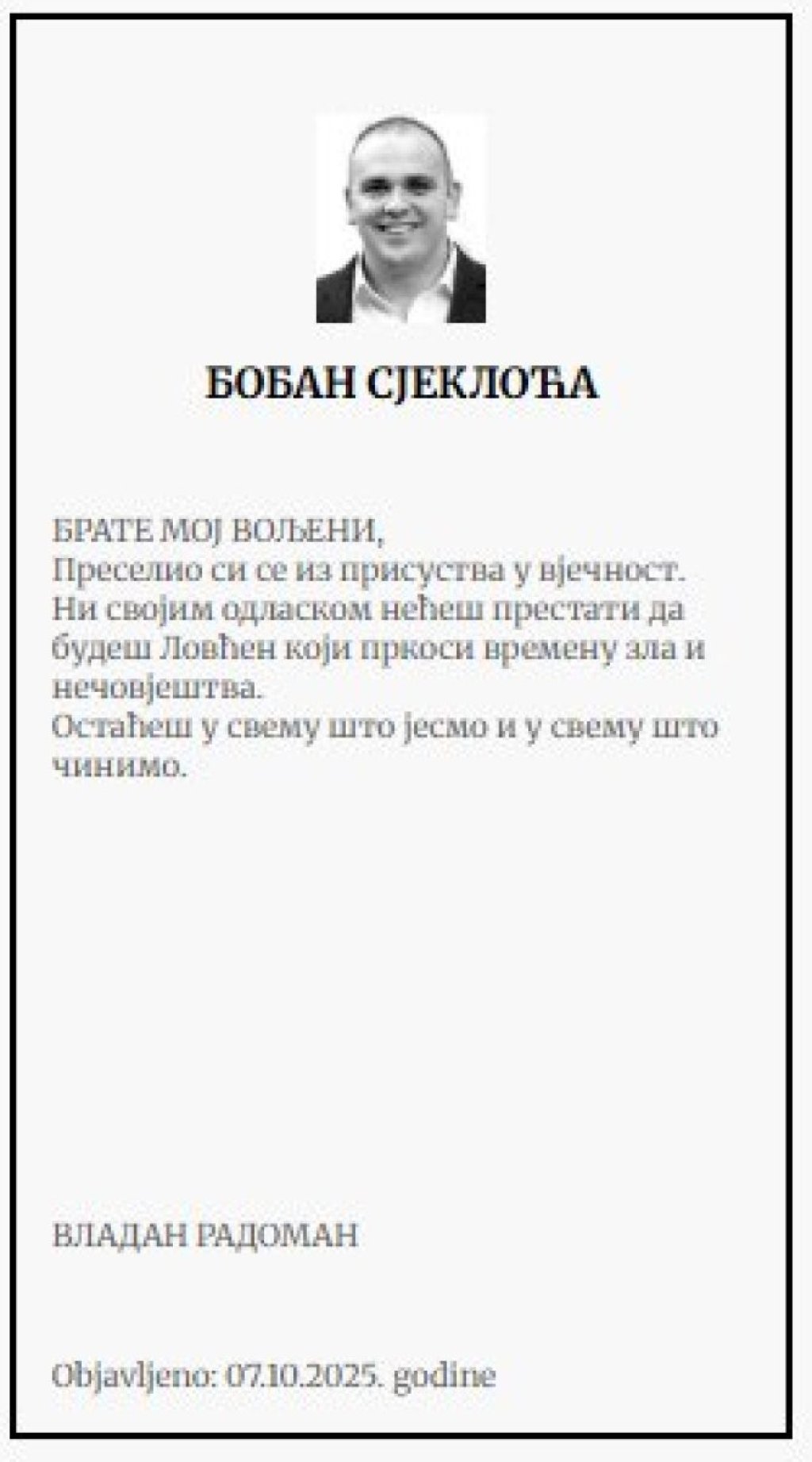 Porodica, prijatelji i saborci iz klana, oprostili su se putem čitulja od brutalno ubijenog visokopozicioniranog pripadnika "škaljarskog klana" - Bobana Sjekloće.