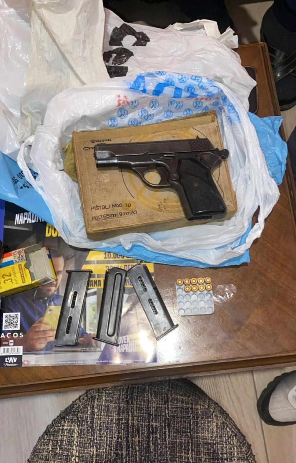 Policija u Rumi je prilikom kontrole putničkog automobila „mercedes“ kojim je upravljao S. M. (30), ispod sedišta suvozača, pronašla torbicu u kojoj se nalazio pištolj sa dva pripadajuća okvira i četrnaest metaka.