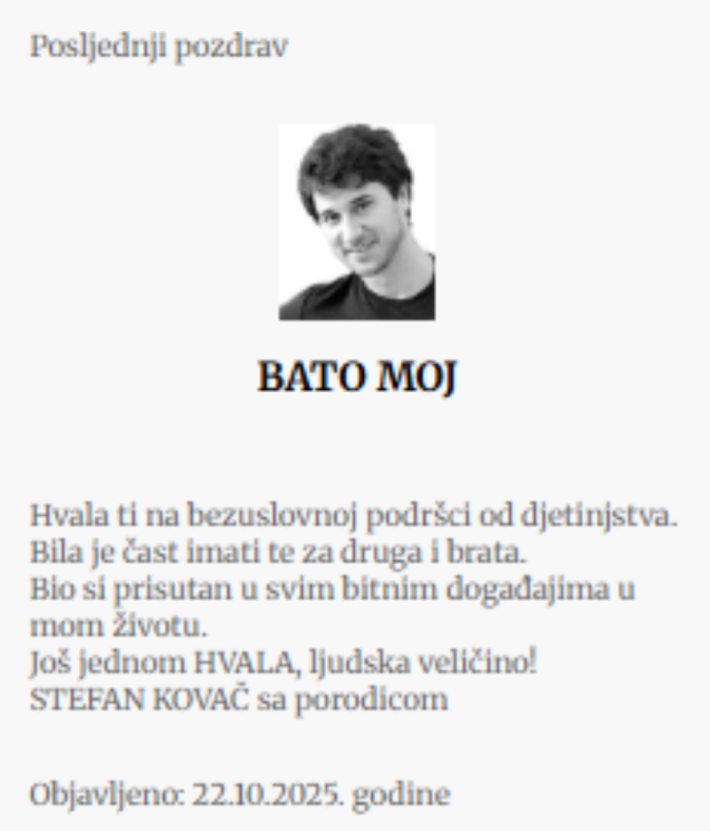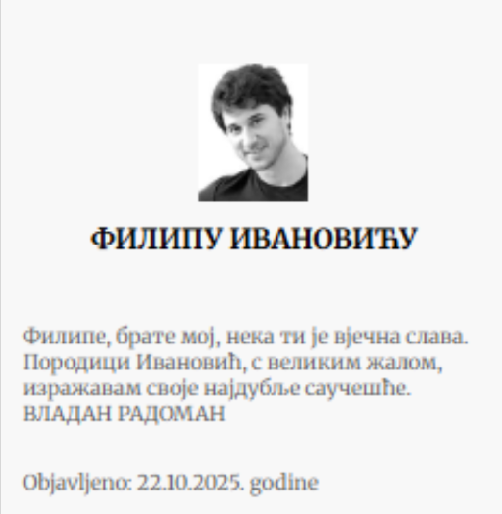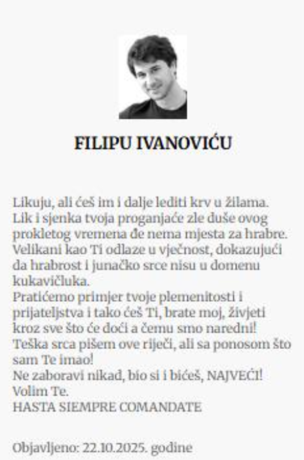 "Brate moj, neka ti je večna slava. Porodici Ivanović, s velikim žalom, izražavam svoje najdublje saučešće".