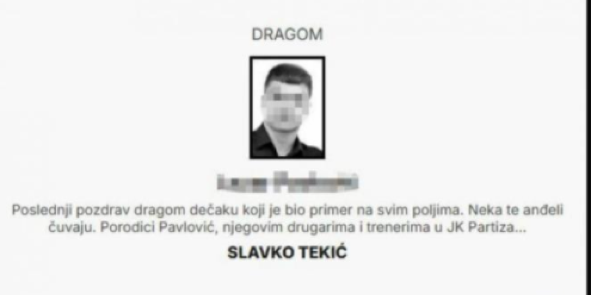 ''Poslednji pozdrav dragom dečaku koji je bio primer na svim poljima. Neka te anđeli čuvaju. Porodici, njegovim drugarima i trenerima u JK Partizan iskreno saučešće,'' stoji u čitulji.