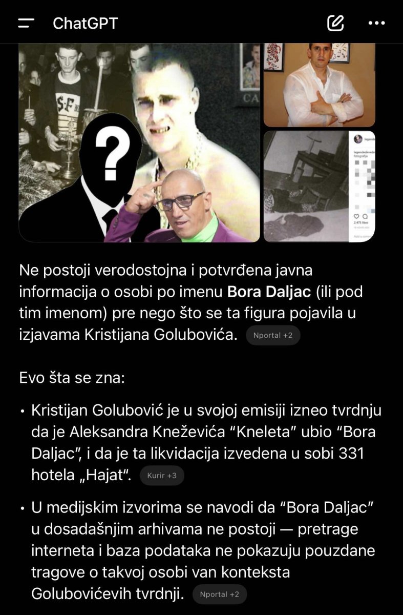 Kako njegovo ime nismo našli na ''Guglu'', pitali smo ''ChatGPT'' koji takođe, nije imao odgovor na naše pitanje, te navodi da o čoveku pod imenom Bora Daljac ne postoje nikakve informacije, već da je on označen od strane Golubovića kao ubica Aleksandra Kneževića Kneleta.