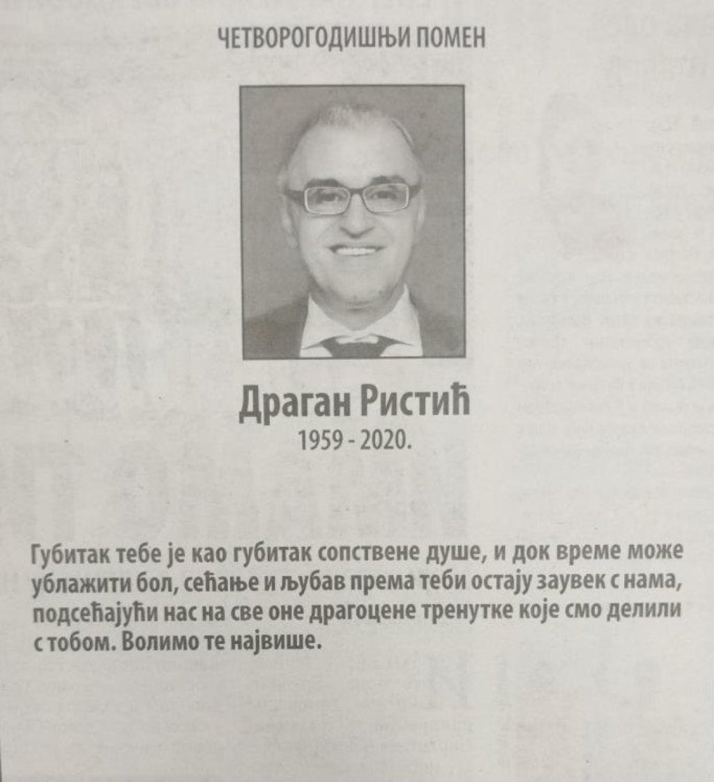 Dragan Ristić (61), zvani Čađo, vlasnik poznatog beogradskog restorana "Košuta" i noćnog kluba "Hram", i kum Željka Rutovića, aktera kultnog filma "Vidimo se u čitulji" ubijen je pre tačno tri godine u mafijaškoj sačekuši ispred svoje kuće u naselju Kaluđerica.