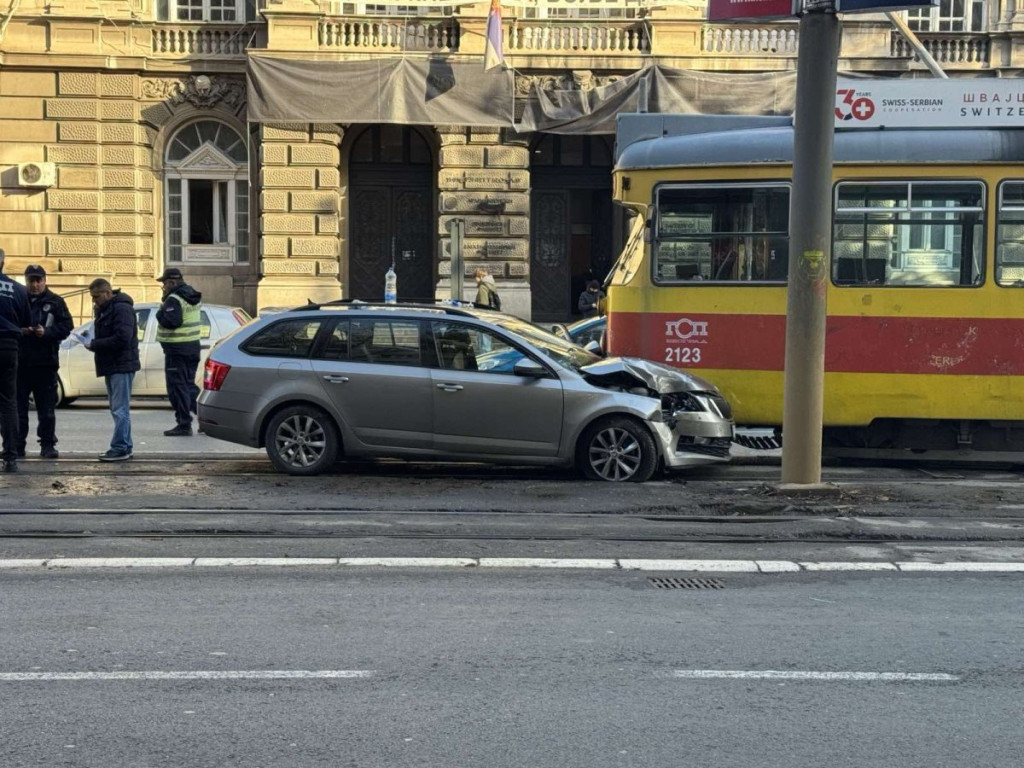Kako se vidi na slikama automobil marke "škoda" podleteo je čeono pod tramvaj. Prednji deo vozila potpuno je smrskan.