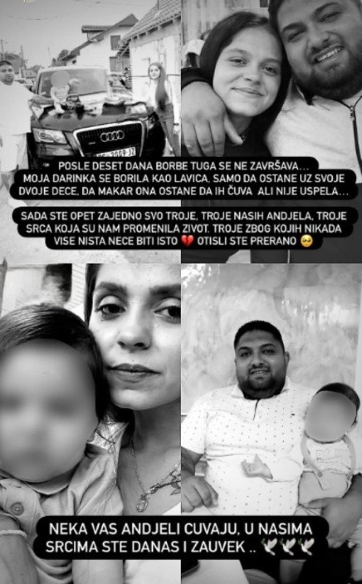 ''Posle 10 dana borbe, tuga se ne završava. Moja Darinka se borila kao lavica. Samo da ostane uz svoje dvoje dece. Da makar ona ostane da ih čuva. Nije uspela. Sada ste opet zajedno vas troje. Troje naših anđela. Tri srca koja su nam promenila život. Troje zbog kojih više ništa neće biti isto. Otišli ste prerano. Neka vas anđeli čuvaju, u našim srcima ste danas i zauvek,'' navodi se u jednoj objavi na društvenim mrežama.
