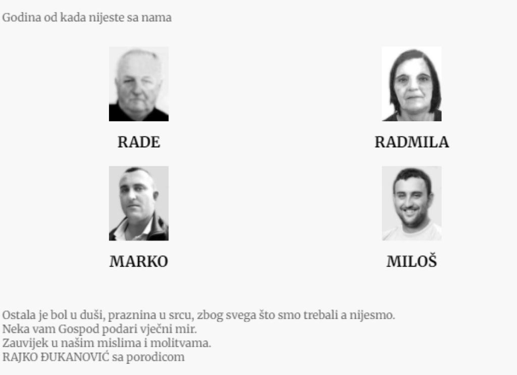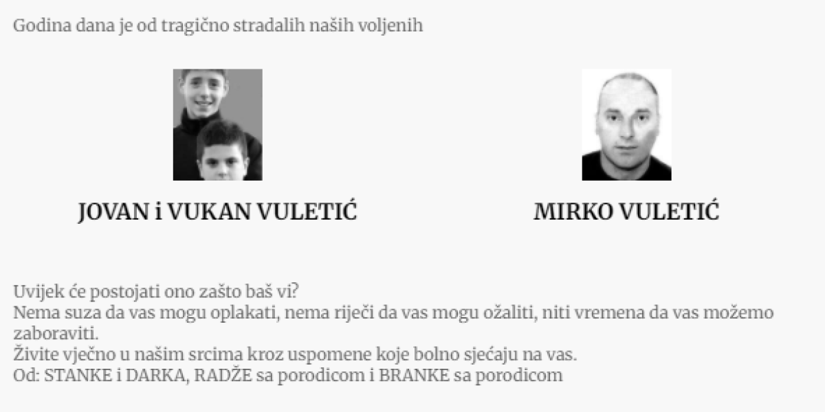 ''Uvek će postojati ono, zašto baš vi? Nema suza da vas mogu oplakati, nema reči da vas mogu ožaliti, niti vremena da vas možemo zaboraviti. Živite večno u našim srcima kroz uspomene koje bolno sećaju na vas,'' stoji u jednoj čitulji,