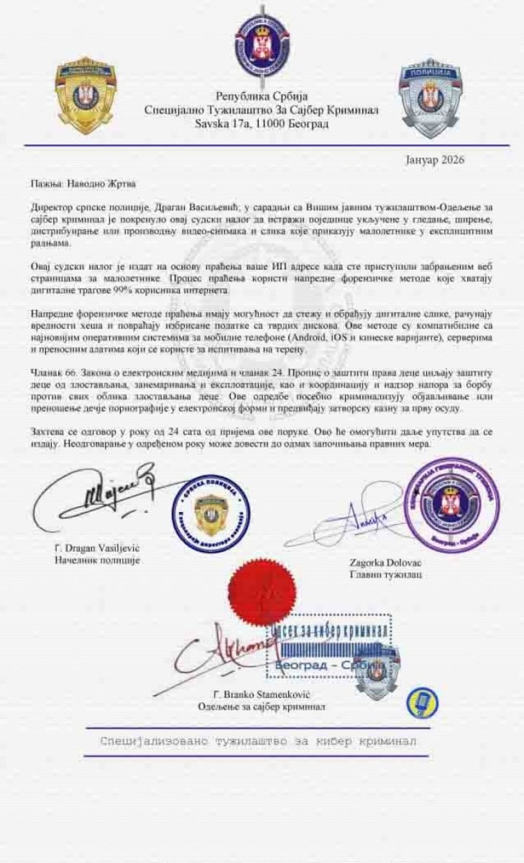 Kako se navodi, građanima se šalju poruke uznemirujućeg i pretećeg sadržaja, u kojima se pominju navodne krivične prijave, IP adrese, kratki i hitni rokovi za postupanje, poput 24 časa, kao i ozbiljne zakonske sankcije.