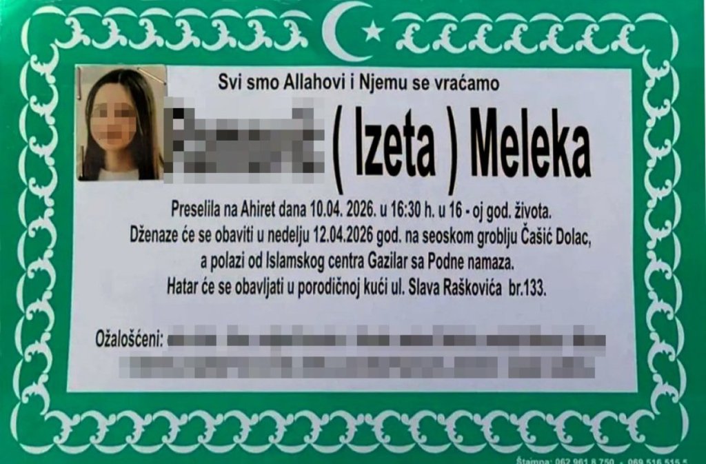 - Dženaza namaz biće obavljena u nedelju, 12. aprila 2026. godine, na seoskom groblju Čašić Dolac, dok će polazak biti iz Islamskog centra Gazilar, nakon podne-namaza. Porodica će hatar primati u porodičnoj kući u ulici Slava Raškovića broj 133. Iza Meleke su ostali neutešni roditelji - otac i majka, sestra, kao i brojna rodbina, prijatelji i školski drugovi koji se opraštaju od devojčice čiji je život bio tek na početku - piše na umrlici.