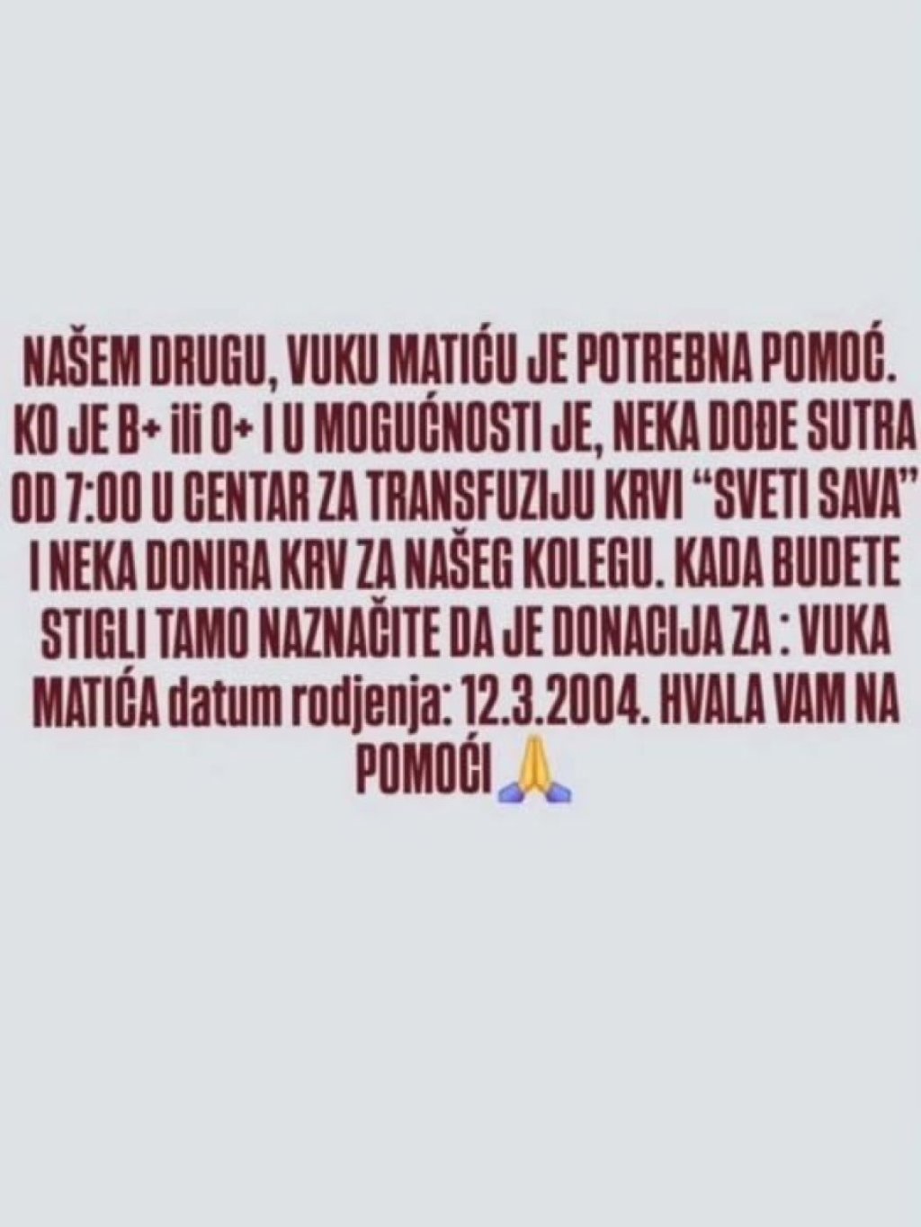 "Našem drugu Vuku Matiću potrebna je pomoć. Ko je B+ ili 0+ krvna grupa i u mogućnosti neka dođe u Centar za transfuziju krvi "Sveti Sava" i donira krv za nešeg kolegu", stoji u objavi.