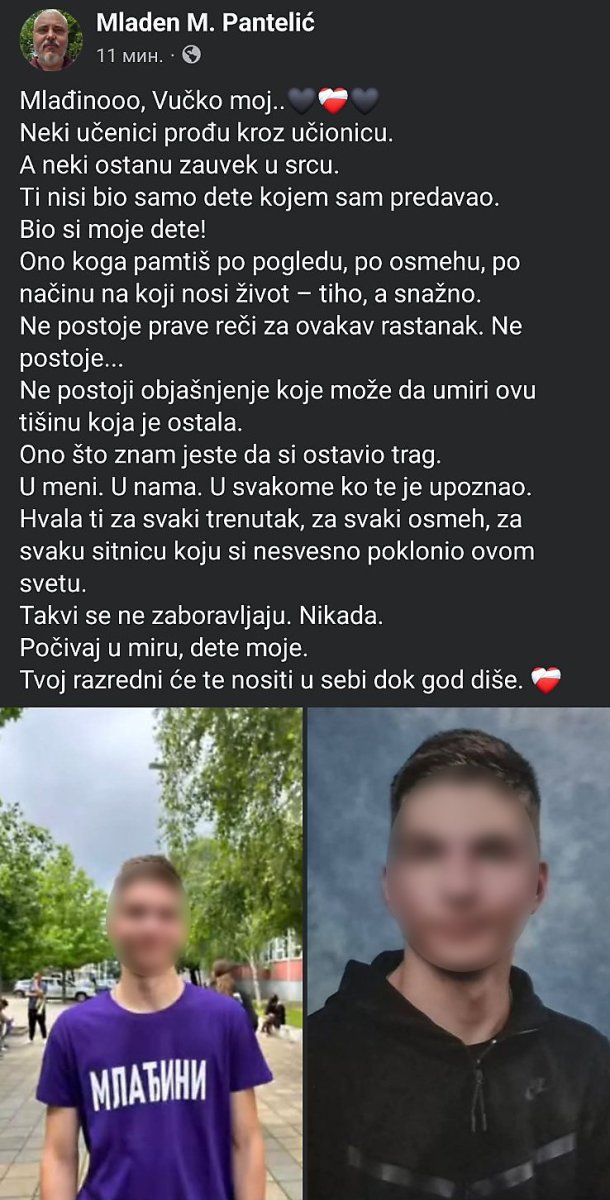- Mlađinooo, Vučko moj... Neki učenici prođu kroz učionicu. A neki ostanu zauvek u srcu. Ti nisi bio samo dete kojem sam predavao. Bio si moje dete! Ono koga pamtiš po pogledu, po osmehu, po načinu na koji nosi život – tiho, a snažno. Ne postoje prave reči za ovakav rastanak. Ne postoje... Ne postoji objašnjenje koje može da umiri ovu tišinu koja je ostala. Ono što znam jeste da si ostavio trag. U meni. U nama. U svakome ko te je upoznao. Hvala ti za svaki trenutak, za svaki osmeh, za svaku sitnicu koju si nesvesno poklonio ovom svetu. Takvi se ne zaboravljaju. Nikada. Počivaj u miru, dete moje. Tvoj razredni će te nositi u sebi dok god diše - piše u emotivnoj objavi.