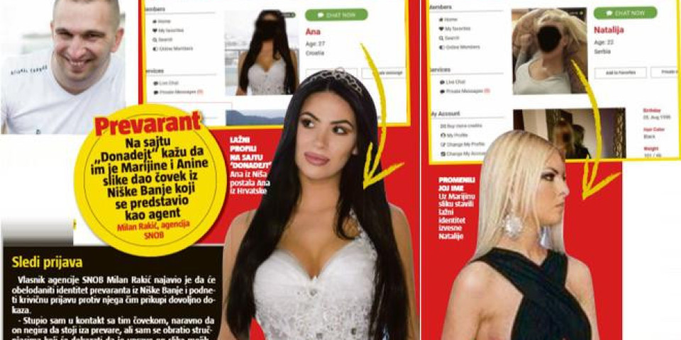 - Čim sam saznao da su slike devojaka iz moje agencije na sajtu "Donadejt", kontaktirao sam njegove administratore i dobio odgovor da se iza ove prevare krije čovek iz Niške Banje, čiji sam identitet posle mnogo muka uspeo da utvrdim. On je skinuo Anine i Marijine slike sa sajta moje agencije i predstavljajući se kao agent devojaka poslao ih "Donadejtu". Onda je organizovao i čet na internetu, preko kojeg su muškarci iz celog sveta navodno mogli da razgovaraju sa njima dvema. Zapravo je on odgovarao na poruke tih ljudi. Za sve to je uzimao novac od sajta "Donadejt", jer su ti muškarci plaćali članarinu sajtu da bi mogli da razgovaraju da devojkama - kaže nam Rakić.