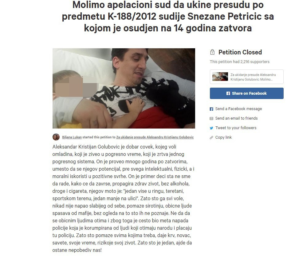 Svojevremeno je pokrenula i peticiju da mu sud ukine zatvorsku kaznu jer je, kako je napisala u obrazloženju, dobar čovek, koji je "žrtva jednog pogrešnog sistema".