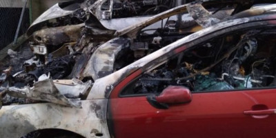 Vozila su bila parkirana uz zgradu, na kojoj su vidljiva oštećenja od plamena.