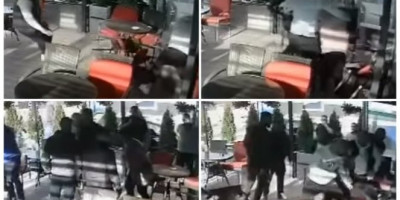 Na snimku se vidi muškarac koji sam sedi za stolom u bašti kafića i priča telefonom, a svega nekoliko sekundi kasnije iznenada dotrčavaju dvojica razjarenih mladića jedan za drugim i počinju nemilice da ga tuku.
