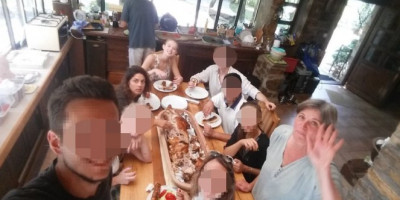 Na prvoj fotografiji se vidi kako Milena i Iva sa prijateljima ručaju u Aleksićevoj kući nadomak Beograda. Sa njima vreme provodi i Aleksićeva supruga,Biljana Mašić, profesor glume na Fakultetu dramskih umetnosti.