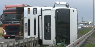 Zbog prevrtanja teretnog motornog vozila obustavljen je saobraćaj na auto-putu E-70, Pećinci – Šimanovci, u smeru Beograd – Batrovci.